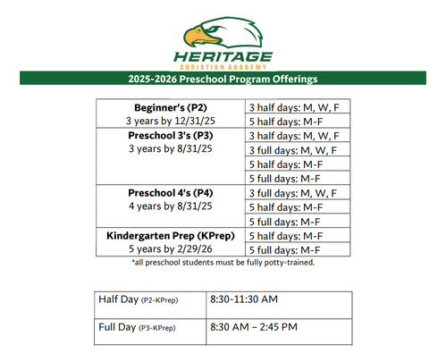 2025-2026 Preschool Program offerings and age requirements