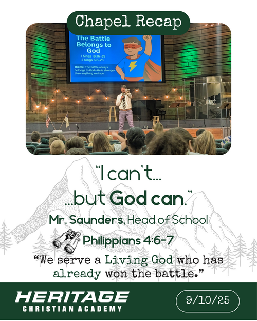 Today was our first regular chapel day, and Mr. Saunders, our Head of School, spoke during both the elementary and secondary chapel sessions. He focused on our theme, emphasizing that there are many accounts in the Bible showcasing how God fights for us. One example he mentioned was how Elijah prayed to God to ignite the soaked altar. The same God who performed that miracle at Mount Carmel has already won every battle for us!