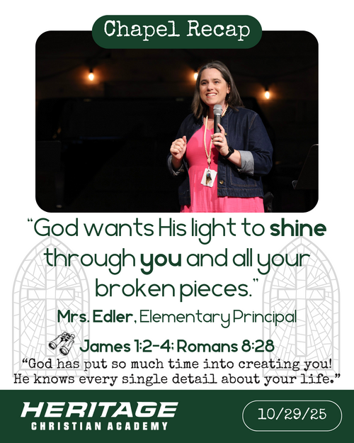 Mrs. Edler, our elementary principal, spoke at our chapels this morning. She thoughtfully shared the process of creating stained-glass art to illustrate how "God uses broken things" — like us. The broken pieces of glass represent our hurts and trials in life, but God uses those broken pieces for good and for His purpose (Romans 8:28). Just as stained glass is polished to allow light to shine through, God continually refines us so that we can shine for Jesus.