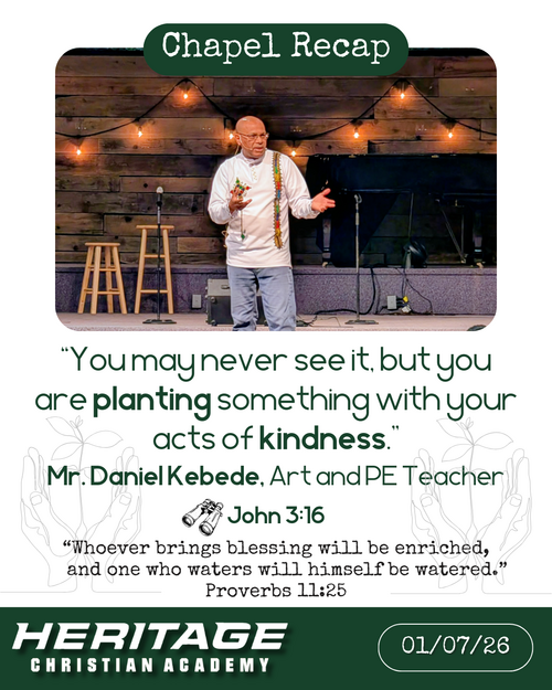 We kicked off the new year with a chapel reflecting on December’s character focus: kindness. Mr. Daniel, our art and PE teacher, inspired students by sharing the importance of showing kindness through giving. He reminded us that we all need to learn and practice generosity, looking to the gift of Jesus as the ultimate example (John 3:16). Mr. Daniel shared a story about the bushmen in Botswana, who always leave water behind for the next traveler—a beautiful act of forward-thinking kindness that we can all embrace in our daily lives. Thank you, Mr. Daniel, for consistently modeling Christlike giving for our community.