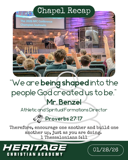 We heard from Mr. Benzel, our Athletic and Spiritual Formations Director. As we prepare to cheer on the Seahawks in the Super Bowl this weekend, he pointed out how sports can unite a community. Just as the Seahawks represent Seattle, we represent Heritage—and ultimately, Christ. Mr. Benzel explained how a rock tumbler shapes, smooths, and polishes rocks. In a Christ-centered community, we help shape one another into the people God created us to be. Mr. Benzel encouraged us to work together like a rock tumbler, refining and supporting each other along the way.