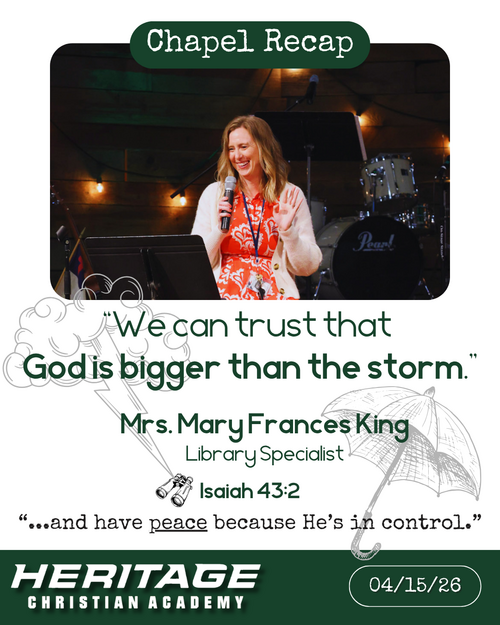 Our favorite storyteller and librarian, Mrs. Mary Frances King, shared a special story at our combined Philippians chapel today. To wrap up a month-long focus on the character trait, Calm, she shared a funny (and scary) personal narrative about getting her leg stuck in the bleachers when she was younger and how, in that moment, she missed the opportunity to remember that Jesus was right there with her. She followed that up with reading a special book, The Storm That Stopped. The book reminded us that Jesus is always with us in every storm we encounter in life, and that we don’t need to worry because He’s in control. Mrs. King encouraged us by saying, “Lots of storms hit our lives, but these stories remind us that we can choose to be calm because Jesus is with us. We can trust that God is bigger than the storm and have peace because He’s in control.” Let’s remember to face each day with courage and calm, knowing we are never alone, thanks to our Savior!