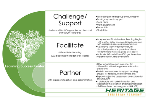 As a private Christian school, Heritage is positioned to offer quality, tailored education all within a Christ-centered environment. From a highly capable student to a student who is struggling, the goal of the LSC is to identify needs proactively before the student becomes disengaged or fails.