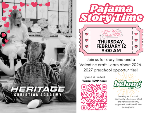 Join us for a story and Valentine craft with our preschool director, Mrs. Fuertes. It's pajama day at Heritage, so feel free to wear your jammies. Blankets and stuffies are welcome!